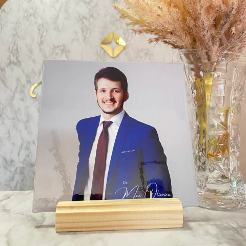 Dê um toque exclusivo e elegante à sua mesa de trabalho com o Azulejo Personalizado 15x15, fixado em uma base de madeira com pinos. Com tamanho ideal para mesas de escritório, ele não ocupa muito espaço, trazendo charme e funcionalidade ao seu ambiente.