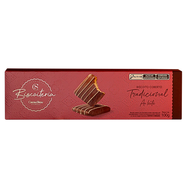 Biscoito coberto com chocolate ao leite e decorado com chocolate branco. A crocância do biscoito com a cremosidade do chocolate, a combinação perfeita!