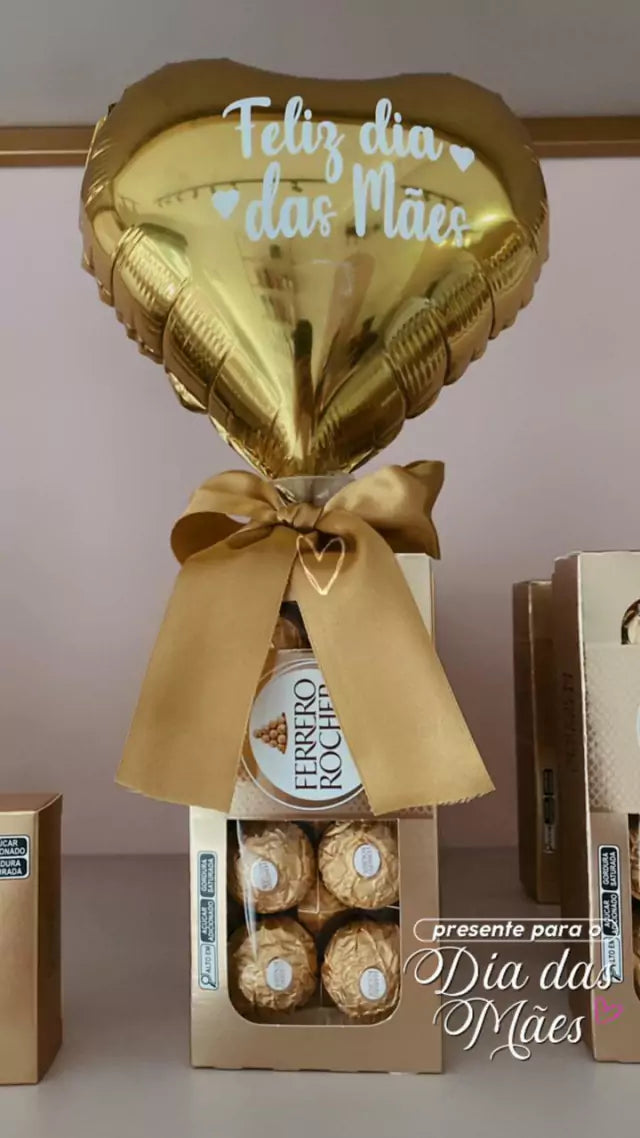 Essa delicada caixa vem com deliciosos chocolates Ferrero Rocher, um balão metalizado em forma de coração com a frase “Feliz Dia das Mães” e um laço dourado que encanta logo de cara.