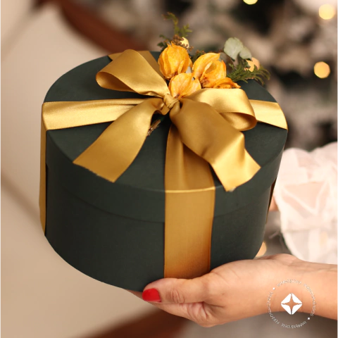 CAIXA CARTONADA NA COR VERDE MILITAR QUE COMTEMPLA LAÇO NA COR A SUA ESCOLHA
