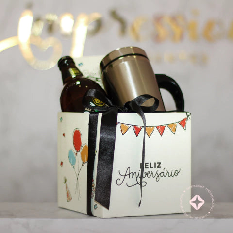 Kit composto por uma caixa cachepot com mensagem de aniversario, boscoito caramelizado cacau show, mini vinho delgrano rosê ou suave de 250ml, e uma barra de chocolate.